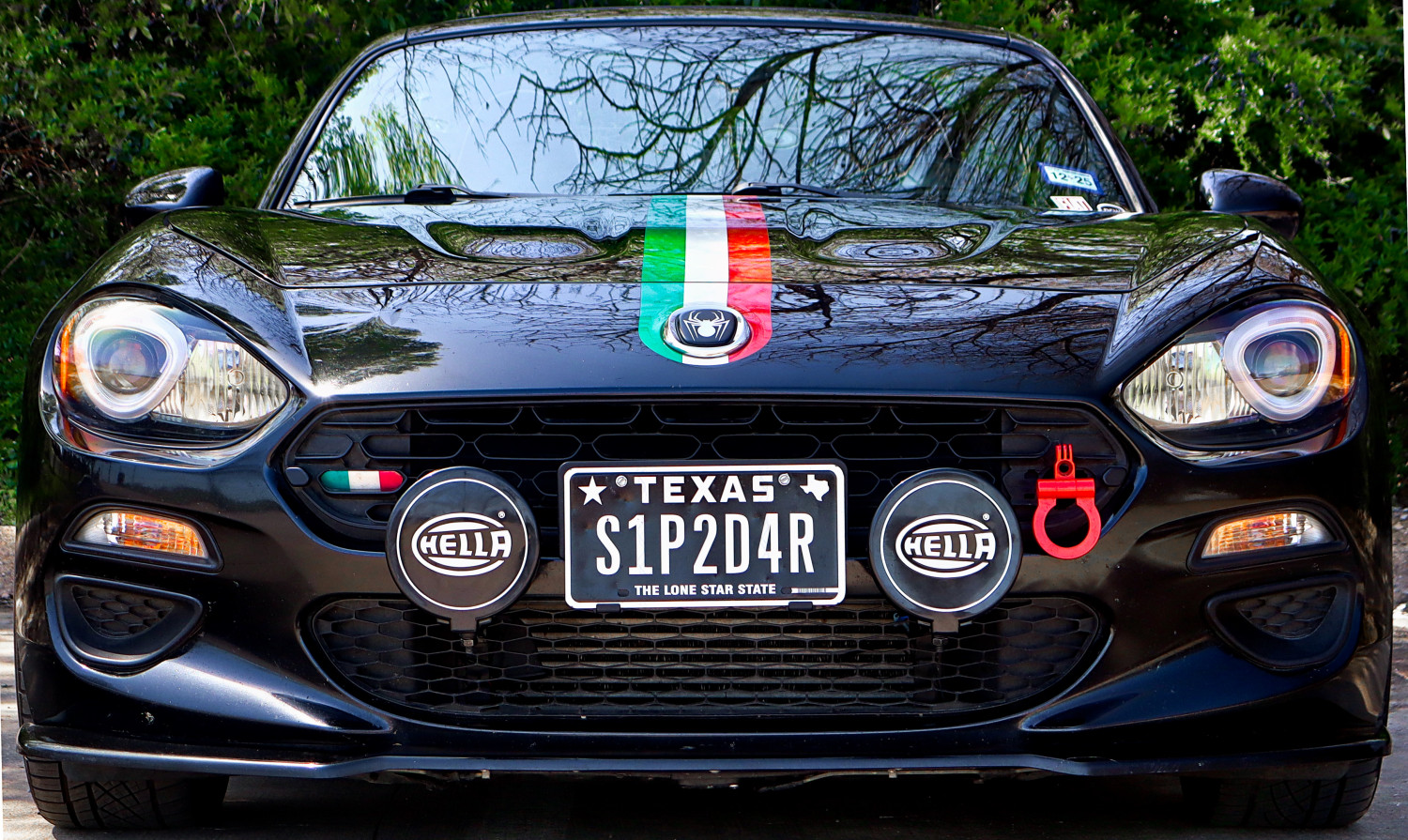 WIND RESTRICTOR: Tall Wind Deflector w/Spider Logo and Lights | COBALT: Dual Hood Lift Kit | GOOD WIN RACING: Tow Hook w/GoPro Mount | AUTOTECHNICA: Shift Knob w/ Real Spider | Sequential Side Markers | Strobe CHMSL | 55lb Trunk Lift Kit | Blue LED Interior/Tunk Lights | Decorative Door Trim | Custom Spider Logo on hood, trunk, steering wheel, whel hubs, center console command knob | "124 Spider" logo for airbag warning light | Custom Italian Flag Center and Side Stripes | Italian Flag Grille Badge | Italian Flag Underglow Lights | 400W Stereo (Ground Zero speaker replacements plus Ground Zero co-axials in cubbyholes behind seats, DB Drive Neo4 400W amp, Nakamichi 10" subwoofer) | REV9 AUTOSPORTS Leather Sun Visor Covers | MAZDA Door Sills | Entertertainment Screen Hood | ASA AR1 17x7 Wheels | "124 Spider" Shoulder Strap Pads